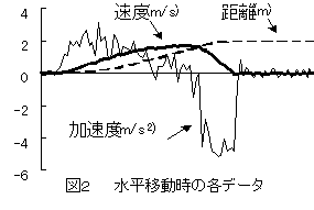 | 実験2 | X軸方向に水平に移動させ,X軸加速度のみで計測した結果を図2に示す。実際に移動した距離は1.95mで,計算値1.93mという結果が得られた。 |