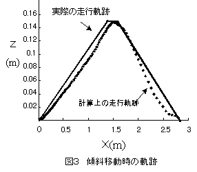 | 実験3 | 高低差をつけてX軸方向に移動させて,X軸加速度とZ軸加速度及びピッチ角度で計測した。図3に軌跡を示す。X軸加速度とZ軸加速度をそれぞれ水平成分(X軸方向)と垂直成分(Z軸方向)をピッチ角度により分解し,それぞれの成分を積分した。その結果,実際に移動した水平距離は2.80m・垂直距離は0.15mで,計算による水平距離2.77m・垂直距離0.14mという結果が得られた。また軌跡も実際の位置座標をよくトレースしていた。 |
