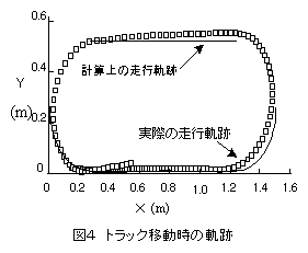 | 実験4 | 進行方向に対し,センサユニットのX軸が,常に同方向になるように平面上のトラックを移動させた。この方法ではX軸加速度をヨー角により成分分解して,距離データを算出した。この場合の軌跡を図4に示す。実際に移動した軌跡と計算上で求めた軌跡を比べると,旋回部で少し軌跡がずれたが,動きが単純であったために,良好な位置検出を行うことが出来た。 |