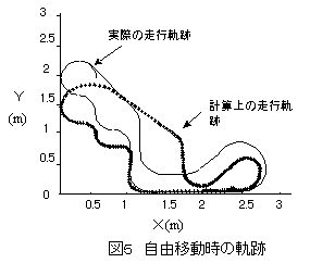 | 実験5 | 実験4と同様に水平面を自由に移動させ,X軸加速度とヨー角で計測した。軌跡を図5に示す。走行パターンはある程度,再現することが出来たが,位置検出には十分な精度が得られなかった。実験4よりも複雑な動きをしたために,加速度や角度に誤差が生じた箇所があり,これらの誤差が次第に累積され,軌跡の大きなずれとなったと考えられる。 |