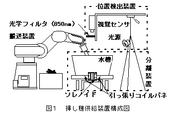 挿し穂供給装置は,図1に示すように,分離装置,位置検出装置,搬送装置から構成される。