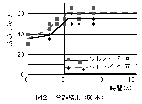 各本数の場合にソレノイドを1回作動させた場合と2回作動させた場合に分けて実験を行った。その結果,本数が多いほどその広がりも大きく,いずれの場合も挿し穂束は6秒前後で分離し,ソレノイドを2回作動させた方が1回だけのときよりもおよそ1.2倍の広がりを得ることが分かった。同時に,50本程度の挿し穂は上記寸法の水槽で分離できることがわかった。挿し穂数50本の結果を図2に示す。