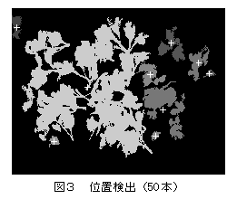 水槽の上方に設置した視覚センサにより分離後の画像入力を行い,2値化,ラベリング,挿し穂の中心位置算出を行った。なお,視覚センサにはキクの穂の分光反射特性を考慮し,近赤外領域まで感度を有するモノクロカメラの前に,850nmの光学フィルタを装着した。