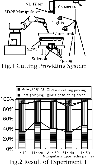 4. 実験結果及び考察 実験1の結果をFig.2に示す。成功率は90%強であり、失敗の多くは水中の挿し穂位置のずれによるものであった。特にソレノイドを作動させた直後に多く見られた。複数本把持されることもあったが、それはほぼ2%以内におさまった。